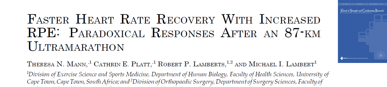 T.N. Mann, R.P/.Lamberts, M.I. Lambert. Faster heart rate Recovery with increased RPE: Paradoxical responses after an 87-km Ultramarathon.